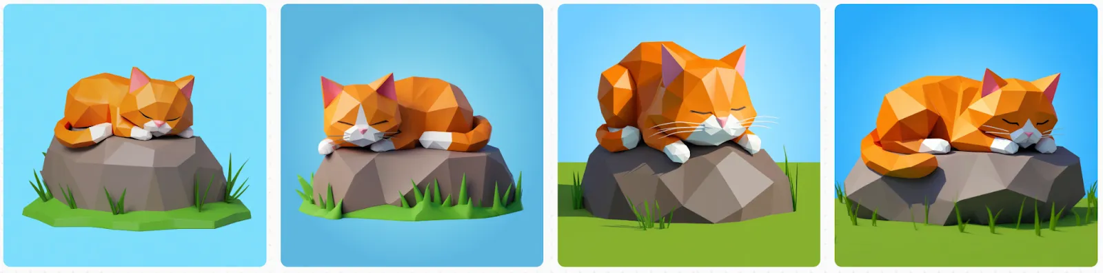 A low poly 3d rendered illustration of a ginger cat napping on a rock with grass, blue backdrop