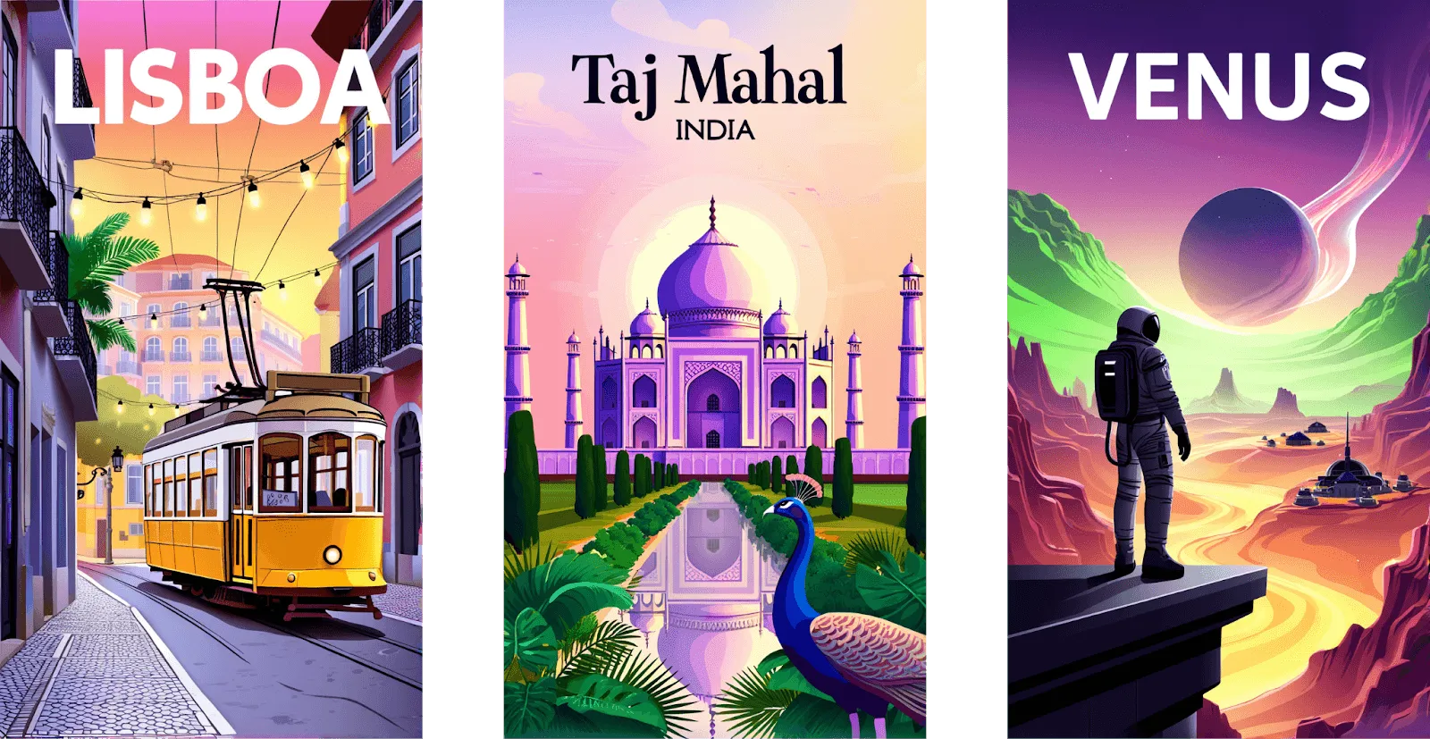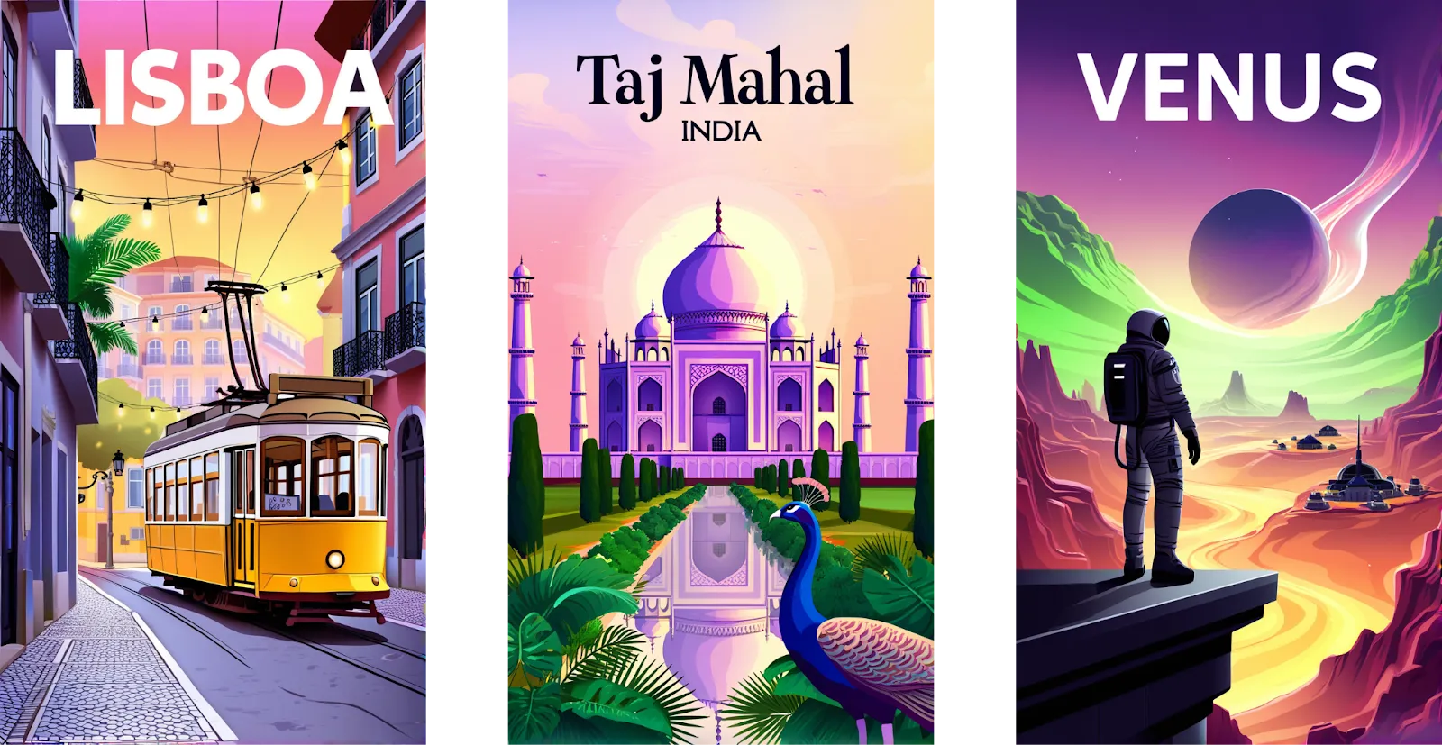 “Taj Mahal” — bold and elegant text crowns a vibrant travel poster to India. The scene features a symmetrical, front-facing view of the Taj Mahal rendered in intricate detail, glowing in a dreamy palette of purples, pinks, greens, and warm oranges. Lush tropical vegetation frames the base, while a majestic peacock stands gracefully in the foreground. The sky radiates soft gradients of pink and orange, creating an enchanting, surreal atmosphere that highlights the monument’s timeless beauty.